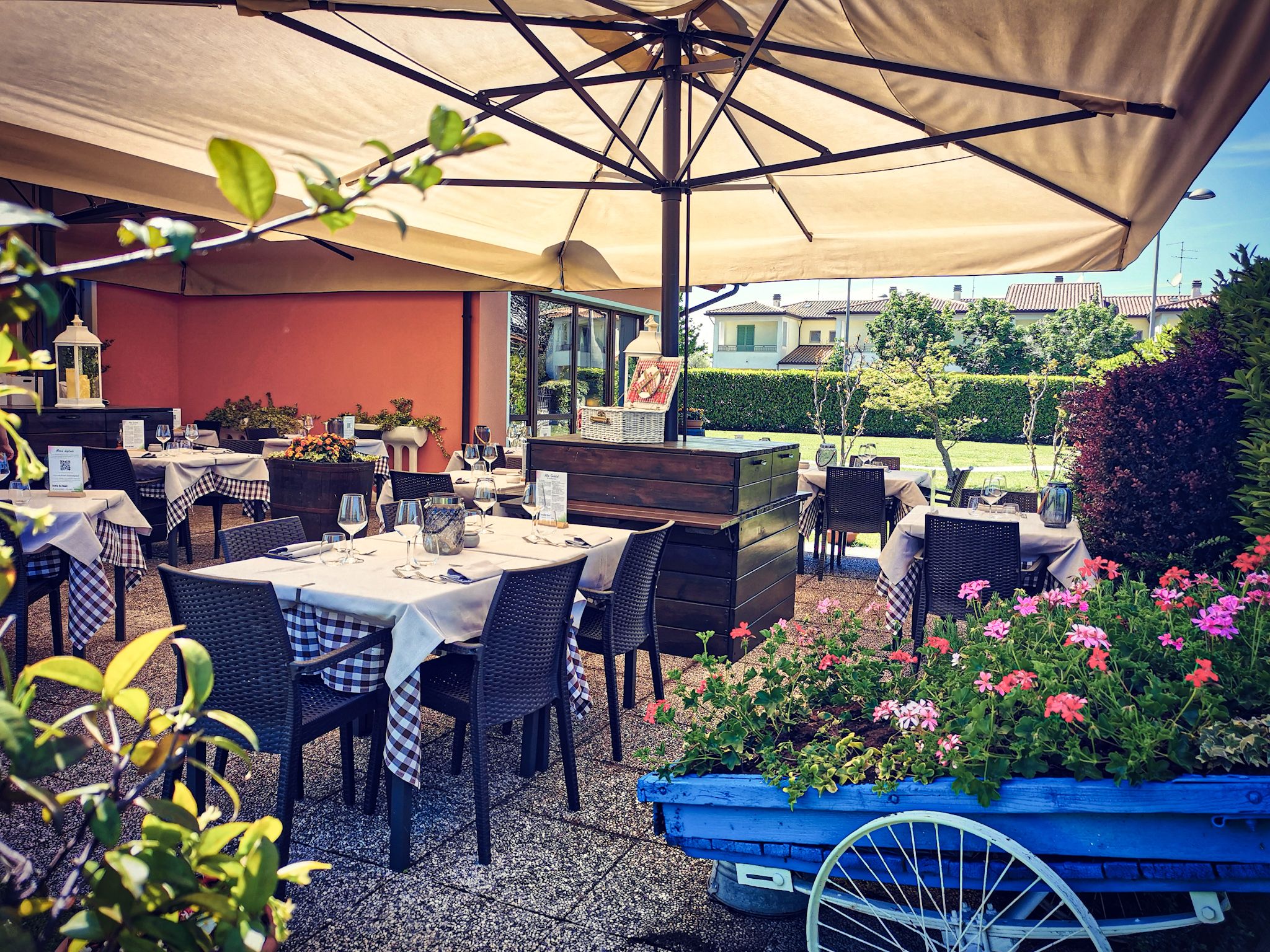 La cornice ideale per il nostro concetto di ristorazione: termine questo, che non significa semplicemente condurre un ristorante ma, con un po’ di presunzione, fornire ristoro, rinfrancare, riproporre il piacevole legame con queste terre generose e piene di vita.